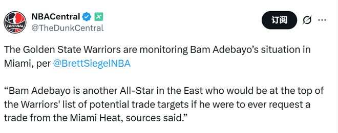 美记:勇士正关注阿德巴约,若他提出交易将成为勇士头号目标
